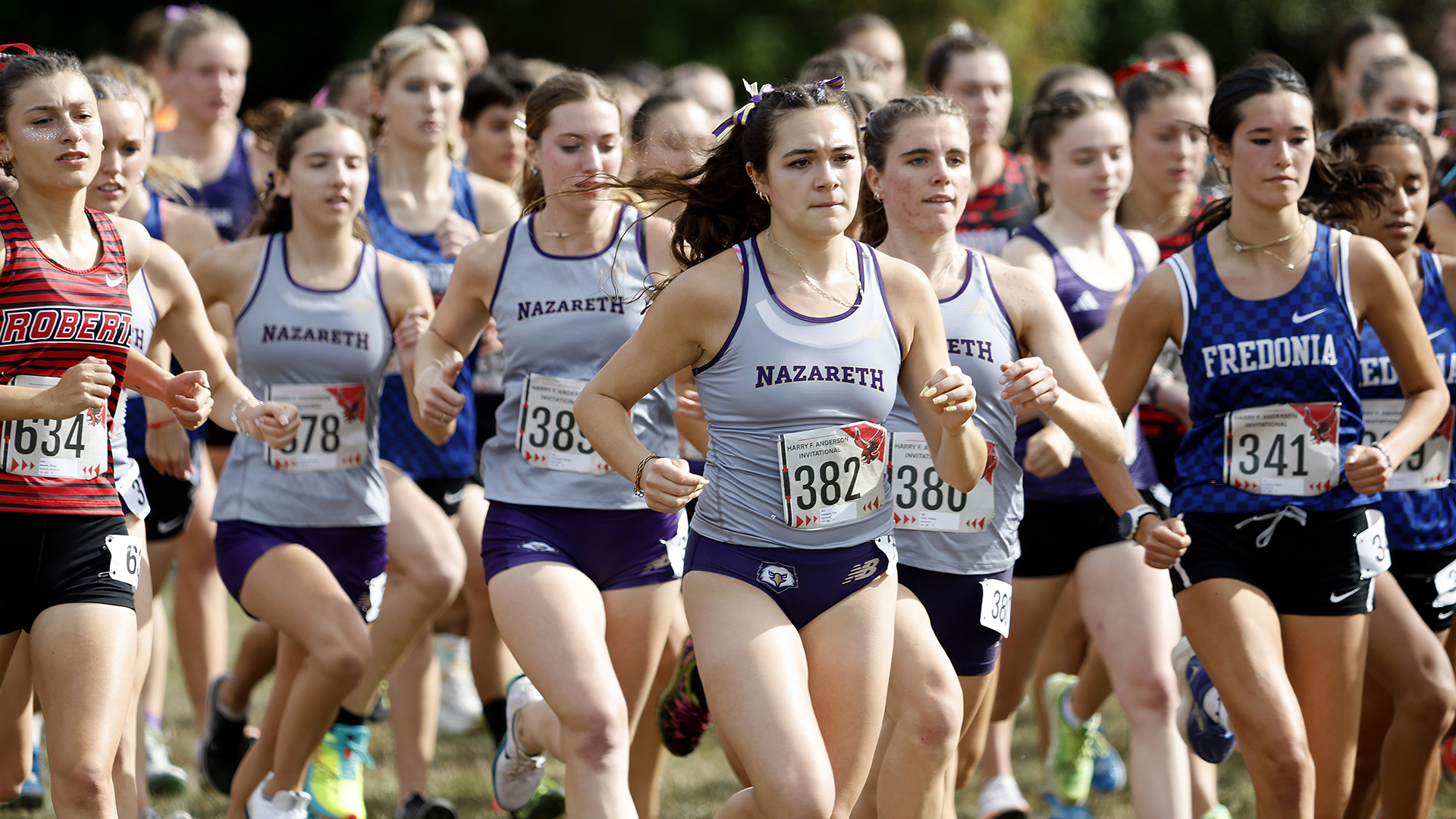 After Brett, freshman Megan Morin was next for Nazareth with a 25th place finish in 16:50.1 and Claire Bargabos also finished in the top-30 with a 28th place finish in 16:51.3. Sophomore Erin Reyner (16:55.3) was 30th overall and junior Hannah Hullihen (17:26.3) rounded out the scoring for Nazareth with a 41st place finish.